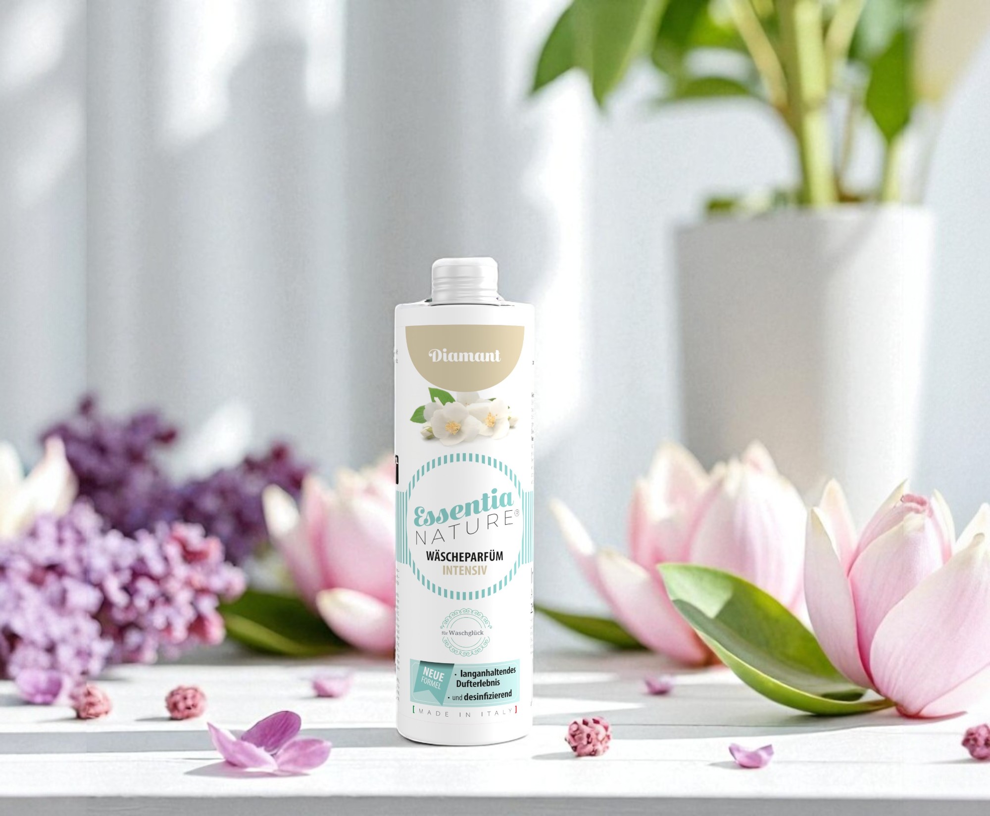 Der Duft von Diamant ist frisch, blumig und sinnlich. Eine feine Mischung aus Flieder, Magnolie, Moschus und Holznoten verleiht deiner Wäsche einen klaren, weichen Duft mit luxuriöser Ausstrahlung – geeignet für alle Textilien.
